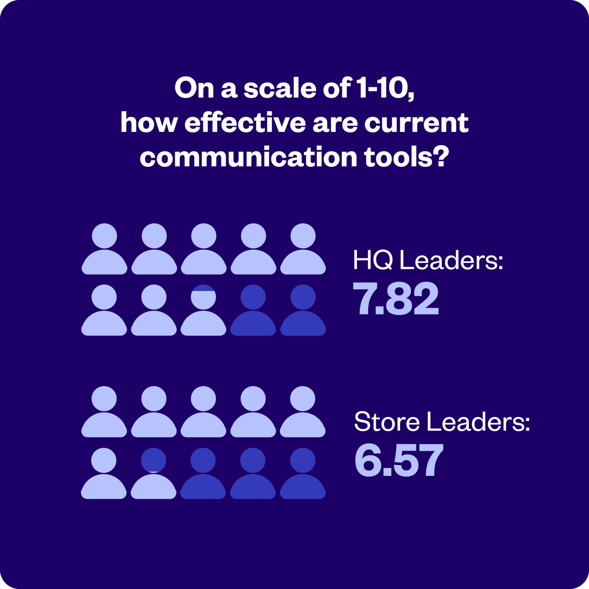 It’s because the tools they’re given make it nearly impossible. When we asked headquarters leaders to rate the effectiveness of their communication and task management tools, they gave them a 7.82 out of 10. Store leaders rated those same tools 6.57.